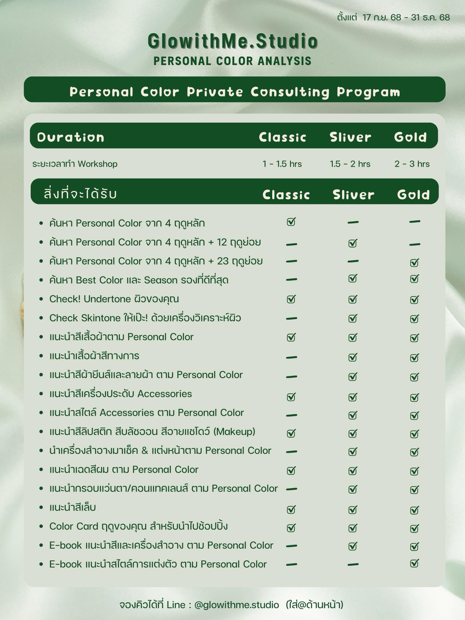 การทำ Workshop Personal Color ที่ GlowithMe.Studio ละเอียดกว่า แค่ดูด้วยตา GlowithMe.Studio ของเราใช้ศาสตร์ของ Personal Color Analysis ซึ่งเป็นกระบวนการที่พิสูจน์แล้วว่าช่วยหาสีที่แท้จริง ไม่ใช่แค่เดาว่าคุณ “น่าจะ” เหมาะกับสีอะไร ด้วยอุปกรณ์มาตรฐานนำเข้าจากประเทศเกาหลี และ ญี่ปุ่น อาทิ ชุดผ้าทดสอบสีและอุปกรณ์วิเคราะห์โดยเฉพาะสำหรับผู้หญิง ผู้ชาย และ คู่บ่าวสาว